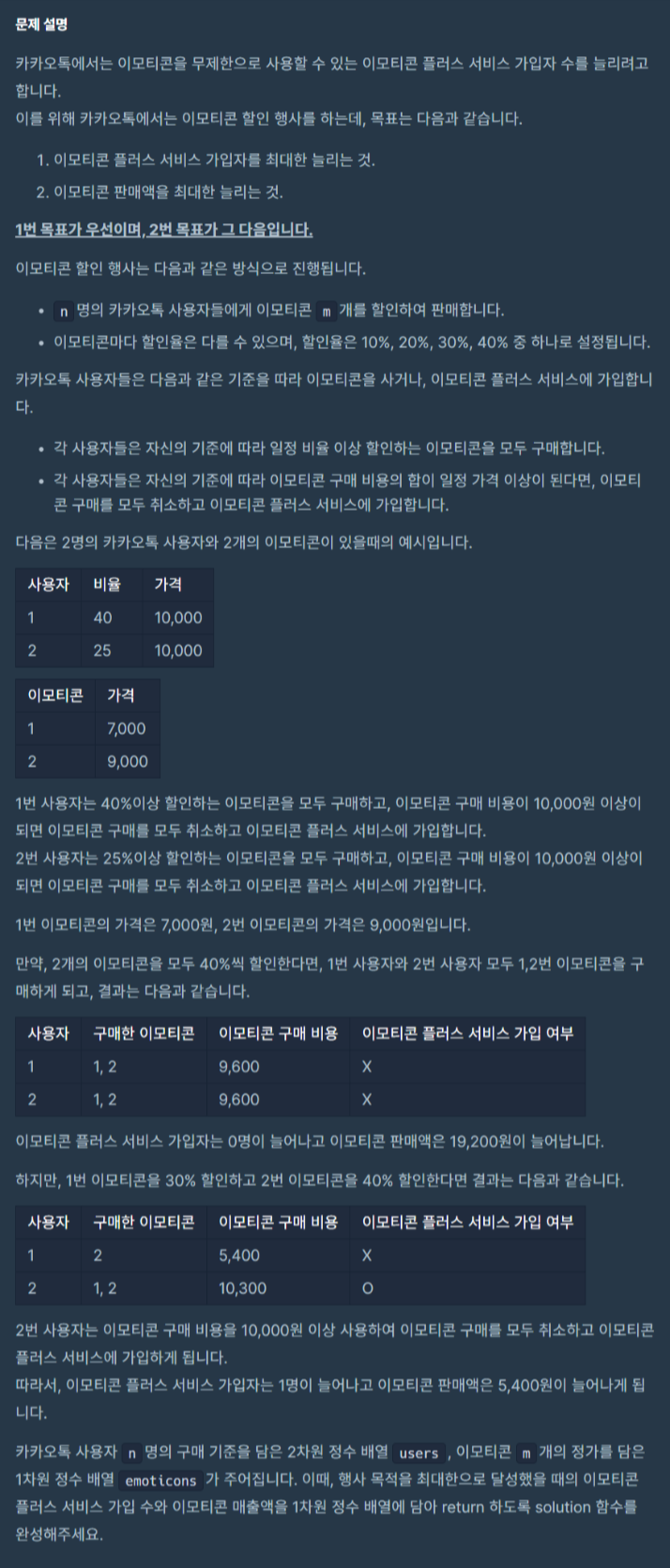 - 각 이모티콘마다 [10, 20, 30, 40] 할인율에 대해