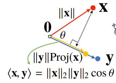 - 내적은 정사영된 벡터의 길이와 관련이 있는데, 정사영의 길이를 벡터 y의 크기|y| 만큼 조정한 값이다.