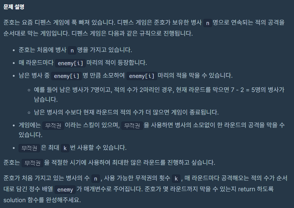 - 이미 k개의 무적권을 모두 사용한 경우, 해당 스테이의 적의 수가 무적권을 사용한 스테이지의 가장 작은 적의 수보다 크면 무적권 사용 변경, 이전에 사용한 무적권의 적의 수는 n-= 해줌