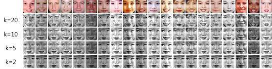 픽셀의 갯수만큼의 차원인 데이터라고 생각할 수 있다. 이러한 데이터들에 PCA를 수행하여 주성분 벡터들을 얻을 수 있다. 이때, k개의 주성분 벡터로 영상 데이터를 표현하면 다음과 같이 표현된다.