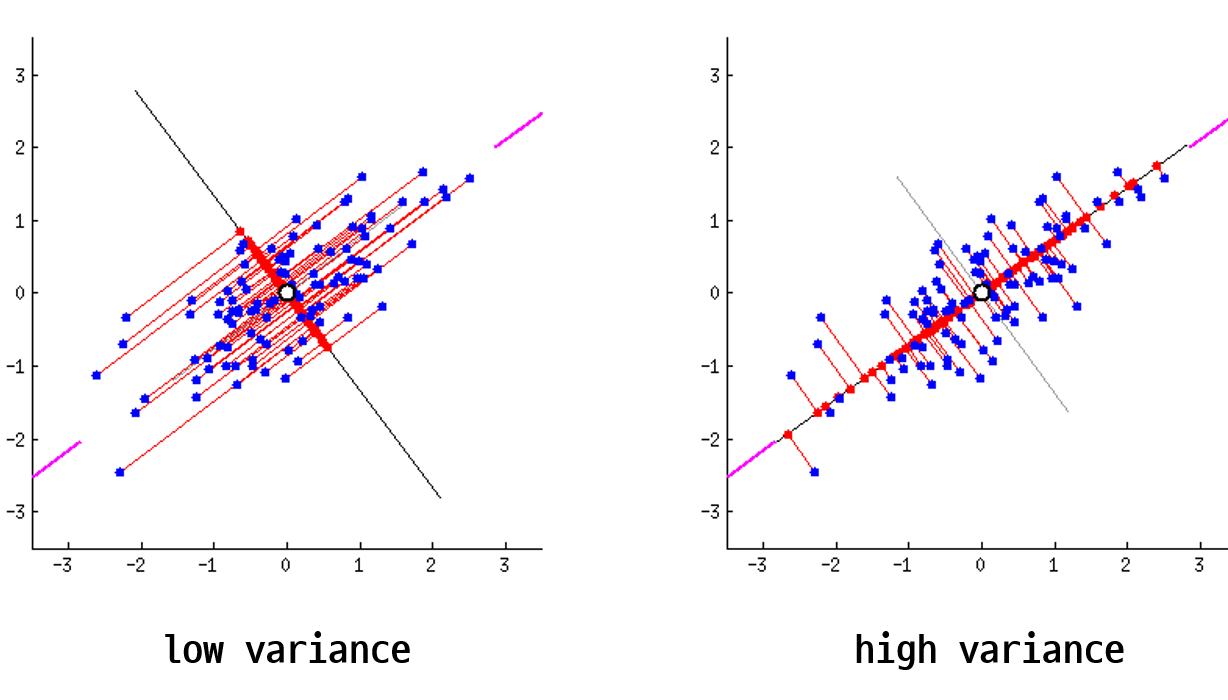 따라서, 주성분에서 데이터들의 분산이 최대화되는 지점을 구하는 것은 데이터 개개의 특징을 파악하기 용이하고