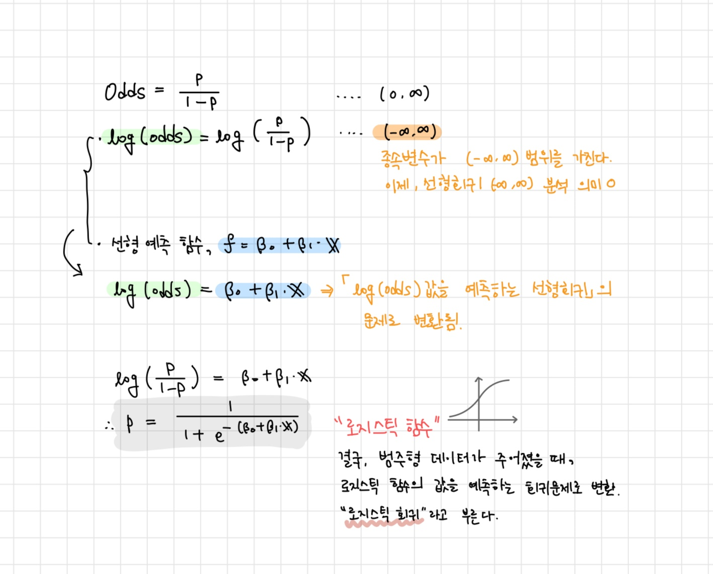 승산에 로짓 변환을 취하면(log(odds)) 종속 변수의 범위가 (-∞,∞)가 되어 이제 선형 회귀( 종속변수의 범위: (-∞,∞)) 분석이 유효한 문제가 됩니다.