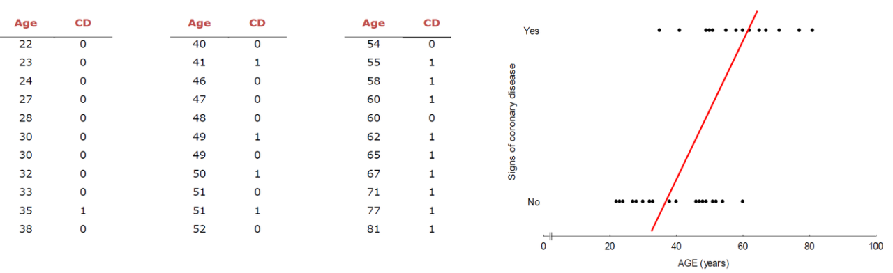 연속변수를 예측하는 선형회귀 모델은 0과 1만이 의미가 있는 다음의 데이터를 잘 설명하고 있다고 보기 어렵습니다.