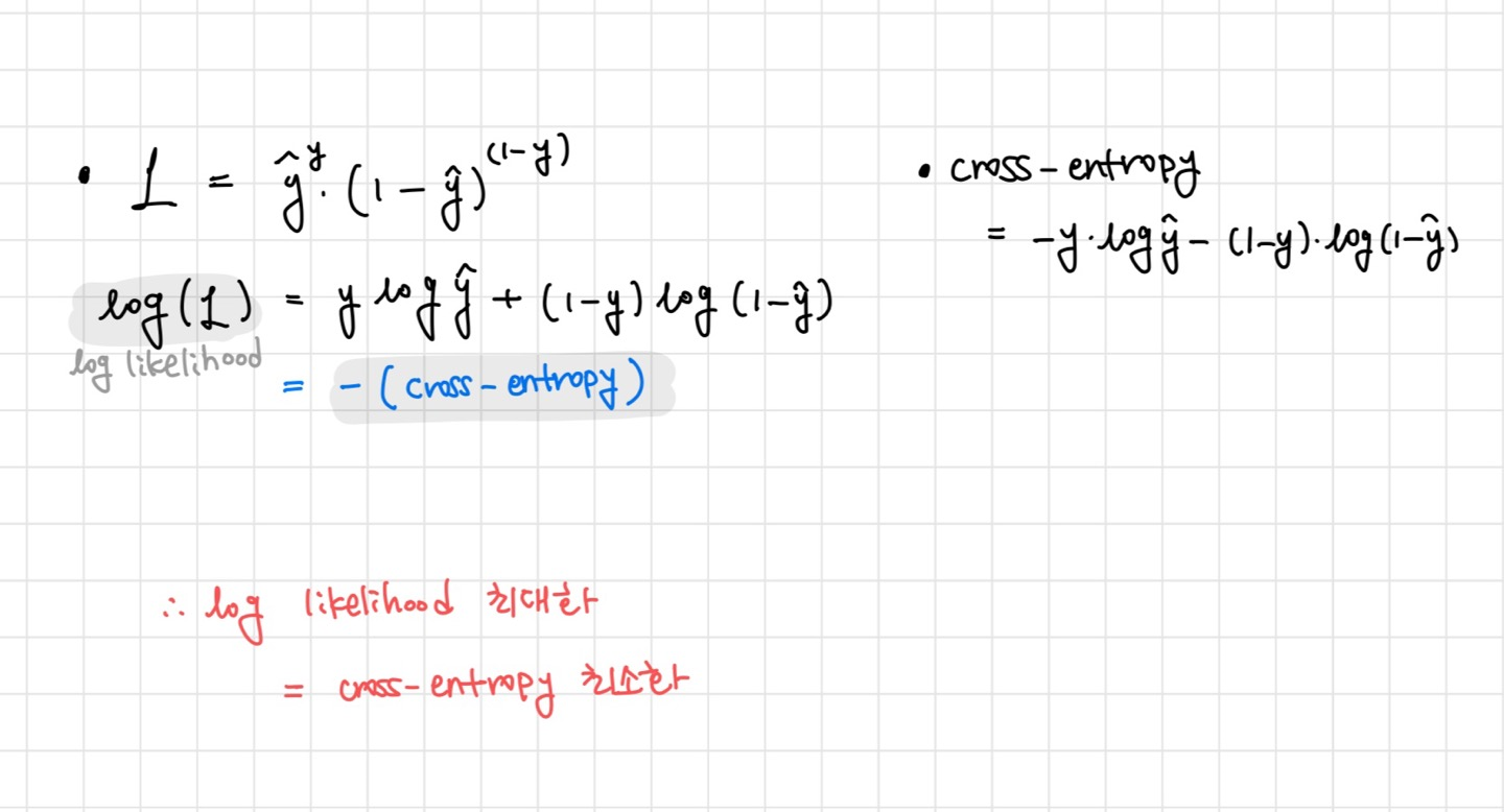 어떤 데이터가 0, 1로 예측될 확률을 각각 ŷ , 1−ŷ라고 하면 로그 우도(log Likelihood)와 cross entropy의 관계는 다음과 같습니다.